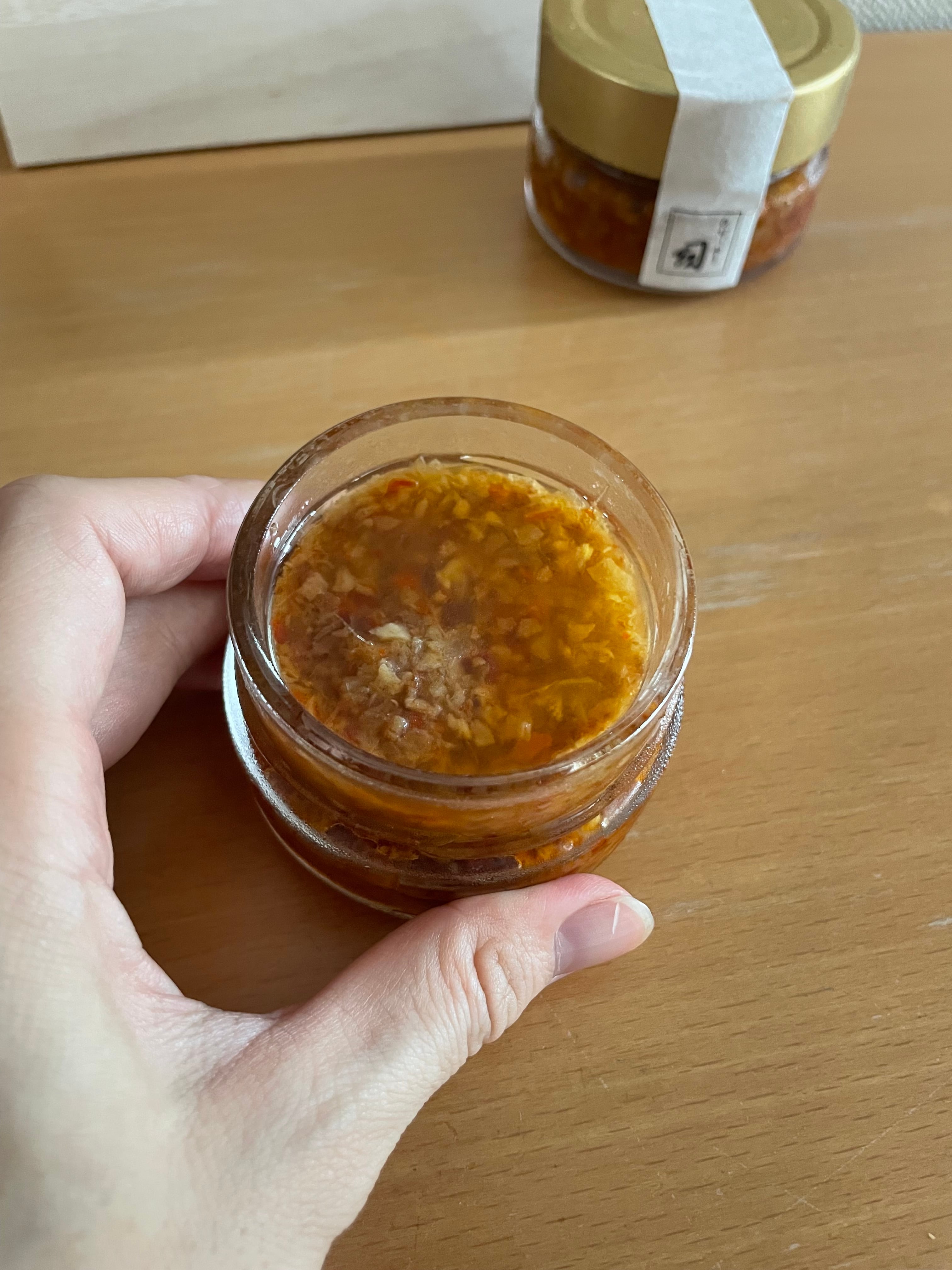 材料:エシャロット、太白胡麻油、生姜、セミドライトマト、ナンプラー、鰹節、紹興酒、大蒜、塩、一味唐辛子